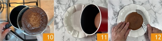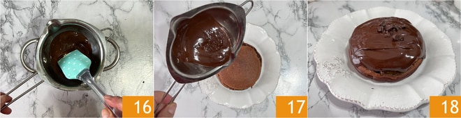 Derreta o chocolate em banho-maria ou no micro-ondas 16 e despeje sobre o sacher cicciopancake para cobri-lo 17, em seguida, decore com raspas de chocolate e sirva imediatamente 18.