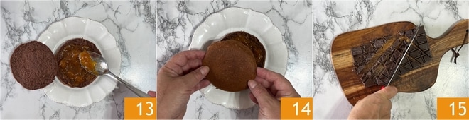 Recheie o interior com geleia de damasco 13 e feche 14. Pique o chocolate amargo 15.
