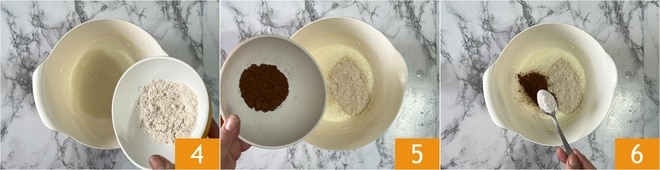 Incorpore também a farinha de aveia 4, o cacau em pó 5 e o fermento 6.