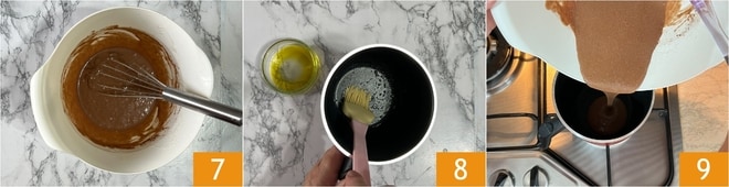 Misture novamente para obter uma massa homogênea e sem grumos 7. Unte com óleo de sementes uma frigideira de cerca de 12 cm de diâmetro e com bordas altas 8 e aqueça no fogo. Despeje a massa 9, cubra com uma tampa e cozinhe por cerca de 10 minutos em fogo baixo.