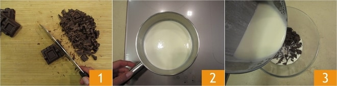 Para preparar a Sacher de colher, comece pela ganache. Pique o chocolate amargo 1 e transfira-o para uma tigela. Aqueça o creme de leite até quase ferver 2 e despeje-o em 3 vezes na tigela com o chocolate 3.