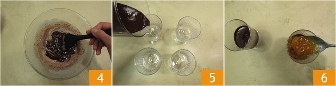 Misture de vez em quando com uma espátula para derreter bem o chocolate 4, até obter uma ganache lisa e fluida. Agora, pegue 4 copinhos de 200 ml. Despeje dentro dois dedos de ganache 5. Transfira para a geladeira por cerca de 15-20 minutos, mantendo a ganache restante à temperatura ambiente, para não solidificar. Agora, pegue os copinhos e despeje dentro de cada um cerca de 60 g de geleia de damasco 6.