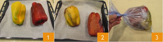 Para preparar a salada com atum, mussarela e pimentões, comece lavando estes últimos, em seguida coloque-os em uma assadeira forrada com papel manteiga 1 e deixe assar a 250° por cerca de 30 minutos ou até notar que a pele está tostada 2, ocasionalmente vire os pimentões, assim obterá um cozimento uniforme. Uma vez assados, coloque os pimentões em um saco de alimentos e deixe-os fechados para esfriar 3.