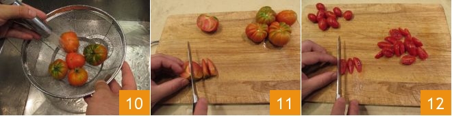 Depois de lavar os tomates 10, retire o pedúnculo, corte-os ao meio e depois em fatias para obter 4-5 gomos de cada metade 11, faça o mesmo com os tomates cereja 12 cortando-os em 4 partes.