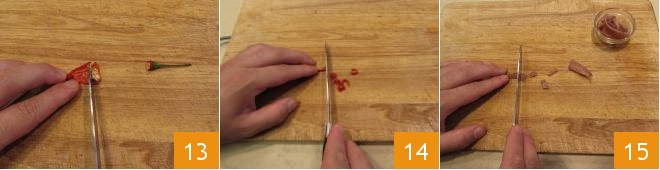 Retire o pedúnculo da pimenta e depois corte-a no sentido do comprimento, retirando as sementes internas com a ponta da faca 13, depois fatie finamente 14, assim você terá apenas o aroma da pimenta sem que ela dê um sabor marcadamente picante. À parte, pique os filés de anchova 15