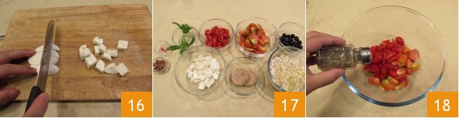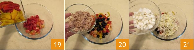 Depois adicione os pimentões 19, as azeitonas pretas inteiras e o atum que você desfiou com um garfo 20, a endívia e os cubos de mussarela 21.
