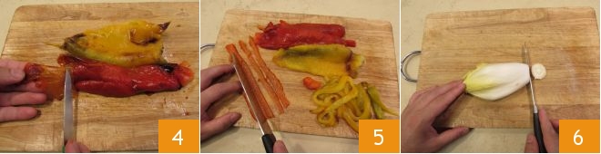 Uma vez que os pimentões estiverem mornos, retire a pele, que sairá muito facilmente, 4 em seguida divida-os ao meio, retire a parte superior e as sementes internas e depois corte-os em tiras de cerca de 1 cm 5. Limpe a endívia retirando a extremidade 6,