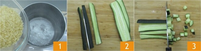 Para preparar a salada de arroz à grega, a primeira coisa a fazer é ferver uma panela de água, depois adicionar sal e cozinhar o arroz por 10 minutos 1. Enquanto isso, prepare o tempero: lave os pepinos e corte-os primeiro em fatias 2 e depois em cubos 3.