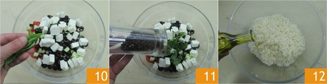 Rasgue as folhas de manjericão com as mãos 10 e tempere com sal, pimenta 11 e um fio de azeite. Após o tempo de cozimento, escorra o arroz e transfira-o para outra tigela. Tempere com um fio de azeite 12 e misture, depois deixe esfriar.