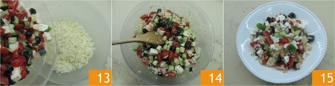 Quando o arroz estiver frio, adicione o tempero 13 e misture bem tudo 14. Sua salada de arroz à grega está pronta para ser saboreada 15!