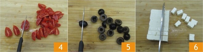 Lave os tomatinhos e corte-os em 4 partes 4, depois corte as azeitonas ao meio 5. Finalmente, corte o queijo feta em cubos 6.