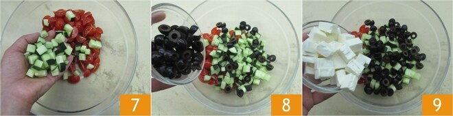 Coloque os tomatinhos em uma tigela junto com os pepinos 7, as azeitonas 8 e o queijo feta 9.
