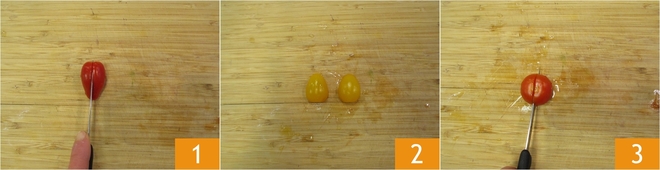 Para preparar a salada de arroz com 4 tomates, primeiro lave bem todos os tomates. Corte ao meio os tomatinhos vermelhos 1 e faça o mesmo com os amarelos 2 e com os tomatinhos cereja 3.