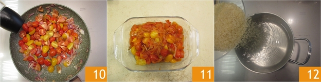 Ajuste o sal 10 e salteie os tomatinhos por cerca de 5 minutos. Transfira-os para um recipiente e reserve 11. Cozinhe o arroz em água fervente com sal conforme o tempo indicado na embalagem.