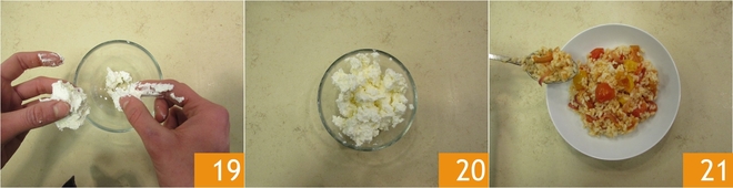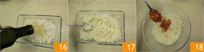 Adicione um fio de óleo 16, misture 17 e deixe amornar. Transfira o arroz para uma tigela grande, adicione os 4 tomates já mornos 18 e misture novamente.