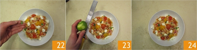 Adicione os pedaços de robiola, folhas de orégano e manjericão, quebrando-as com as mãos 22. Termine com raspas de limão 23, um fio de óleo e sirva sua salada de arroz com 4 tomates 24.