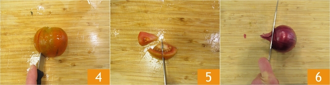 Pegue o tomate camone, remova o pendúculo e corte-o ao meio. Coloque o tomate na tábua de corte com a casca para cima e corte em gomos de 1,5 cm 4. Corte cada gomo de modo a obter 3 triângulos iguais 5. Agora, pegue a cebola e descasque-a 6.