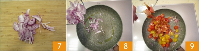 Corte-a em fatias finas 7 e passe para a cocção. Aqueça uma frigideira grande, adicione um fio de óleo e a cebola 8. Deixe refogar em fogo médio-baixo por alguns minutos, adicionando cerca de 20 g de água. Quando estiver bem refogada, adicione os 4 tipos de tomates 9.
