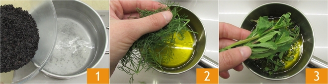 Para preparar a salada de arroz com ervas aromáticas e ovo mole, primeiro leve uma panela de água salgada para ferver, depois adicione o arroz negro integral 1 e cozinhe pelo tempo indicado na embalagem. Enquanto isso, prepare o óleo de ervas: coloque o óleo em uma panela pequena e adicione o funcho 2, a salsa e a manjerona 3.