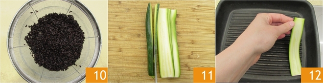 Quando o arroz estiver cozido, escorra e deixe amornar 10. Passe para as abobrinhas: corte as pontas e fatie-as longitudinalmente com espessura de cerca de 3 mm 11, depois coloque-as em uma grelha bem quente 12.