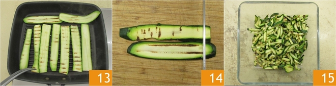 Grelhe as abobrinhas de ambos os lados 13, depois corte-as em tiras no sentido da largura 14. Salgue e reserve 15.