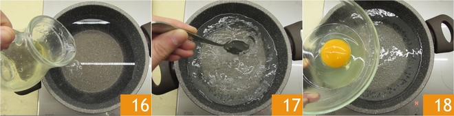 Por último, prepare o ovo mole: encha uma panela funda com água, adicione o vinagre 16 e leve a uma leve fervura. Quando a água estiver borbulhando, abaixe o fogo e crie um redemoinho no centro com uma colher ou batedor 17, depois deslize delicadamente um ovo que você quebrou em uma tigela separada 18.