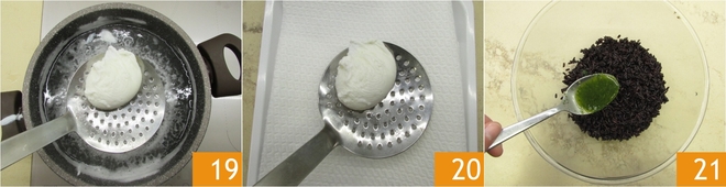 Deixe cozinhar o ovo por 3 minutos sem tocá-lo, depois escorra com uma escumadeira 19 e transfira para uma bandeja forrada com papel toalha 20. Proceda da mesma forma com os demais ovos. Neste ponto, você está pronto para montar o prato: tempere o arroz com o óleo de ervas 21 e misture bem.