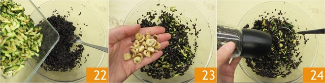 Adicione as abobrinhas 22 e as avelãs tostadas 23, depois misture e ajuste o sal e a pimenta 24.