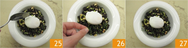 Divida o arroz assim temperado nos pratos e coloque um ovo pochê em cada um, tomando muito cuidado para não quebrá-lo 25. Decore com alguns raminhos de funcho 26 e sirva sua salada de arroz com ervas aromáticas e ovo mole 27!