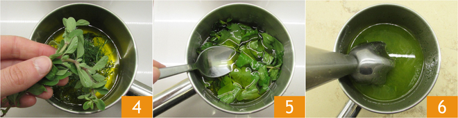 Adicione também a hortelã 4 e aqueça o óleo em fogo baixíssimo por 10 minutos 5, depois misture com um mixer de imersão 6. Transfira o óleo aromatizado para a geladeira até o momento de utilizá-lo.