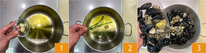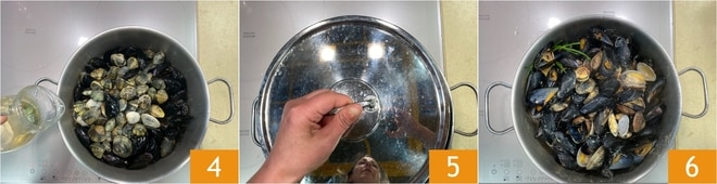 Regue com vinho branco 4 e cubra com uma tampa 5. Deixe cozinhar por alguns minutos em fogo médio-alto, até que se abram 6.