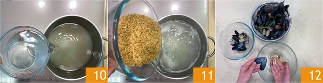 Despeje o líquido coado em uma panela e dilua com água, leve para ferver sem adicionar sal. Quando ferver, cozinhe o arroz integral 11 pelo tempo indicado na embalagem. Enquanto isso, retire a casca dos mexilhões e das amêijoas 12, deixando alguns com a casca para decorar os pratos.