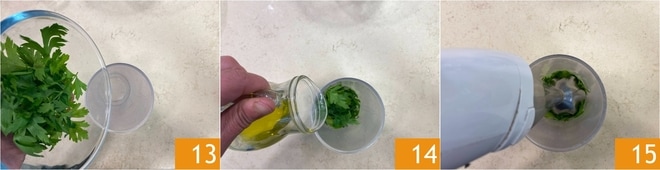 Coloque as folhas de salsa em um copo alto 13, adicione o azeite 14. Bata para obter um pesto cremoso 15.