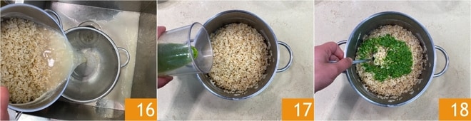 Quando estiver cozido, escorra o arroz 16 e misture com o pesto 17, mexa para dar sabor 18.