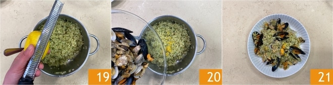 Ajuste o sal, a pimenta e aromatize com a casca de limão 20. Agora, adicione os mexilhões e as amêijoas e misture tudo 20. A salada de arroz com pesto de salsa e frutos do mar está pronta para ser servida 21.