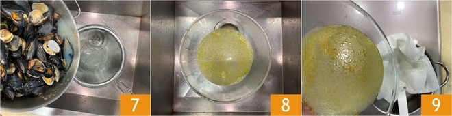 Escorra os frutos do mar 7 reservando o líquido deles 8. Coe com um pano de papel de cozinha para remover as impurezas 9.