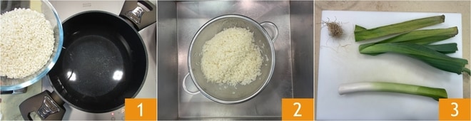 Para preparar a salada de arroz morna com cogumelos, primeiro cozinhe o arroz em bastante água fervente e salgada, deixando-o um minuto a menos do que o tempo de cozimento indicado na embalagem 1. Escorra 2 e deixe esfriar um pouco. Limpe os alhos-porós, corte a base, elimine as folhas verdes e a primeira camada de casca 3.