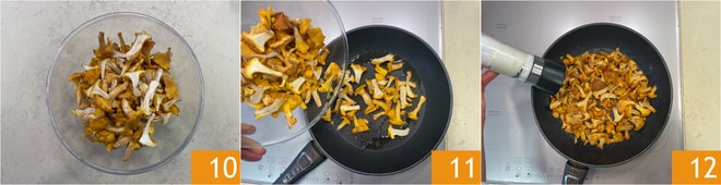 Tente obter cogumelos do mesmo tamanho 10. Cozinhe os cogumelos em uma frigideira quente com um pouco de óleo por cerca de 5 minutos 11, salgue e reserve 12.
