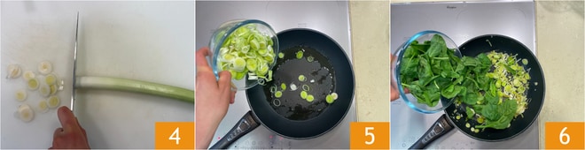 Corte-os em fatias finas 4. Refogue os alhos-porós em uma frigideira quente com um pouco de óleo por cerca de 5 minutos 5, depois adicione o espinafre 6, salgue e continue cozinhando por mais dois minutos.