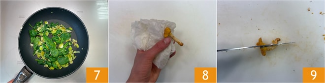 Desligue o fogo e reserve 7. Limpe os cogumelos da terra com um pano úmido 8, corte ao meio os maiores 9.