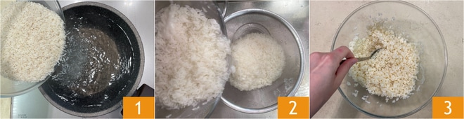 Para preparar a salada de arroz tabule, leve uma panela de água para ferver, então adicione sal e cozinhe o arroz pelo tempo indicado na embalagem 1. Uma vez cozido, escorra o arroz 2 e transfira para uma tigela 3. Deixe esfriar.