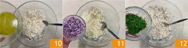 Retome a tigela com o arroz e tempere com a citronete 10, depois adicione a cebola 11 e a salsa picada 12.