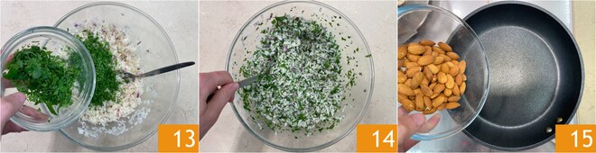 Adicione também a hortelã picada 13 e misture bem tudo 14. Finalmente, toste as amêndoas em uma frigideira antiaderente em fogo médio, tendo cuidado para não queimá-las 15.