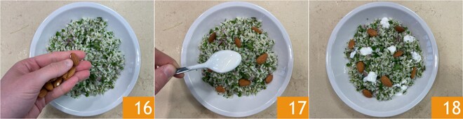 Emprate o arroz temperado e guarneça com as amêndoas torradas 16 e algumas pitadas de iogurte 17. Sua salada de arroz tabule está pronta para ser servida 18!