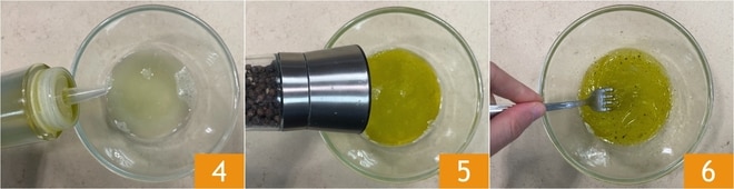 Enquanto isso, prepare a citronete: esprema o suco de limão em uma tigelinha, depois adicione o óleo 4, sal e pimenta 5. Misture para emulsionar 6.