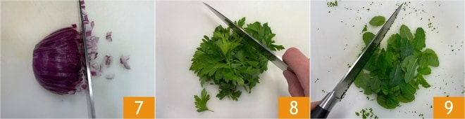 Limpe e corte a cebola em brunoise, ou seja, em cubinhos bem pequenos 7. Pique finamente a salsa 8 e a hortelã 9, que você já terá lavado e secado anteriormente.