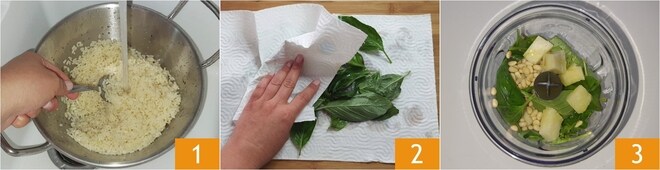 Para preparar a salada de arroz vegetariana, primeiro cozinhe o arroz al dente em bastante água fervente e salgada. Enxágue sob água corrente para parar o cozimento 1, depois deixe escorrer por pelo menos 30 minutos, mexendo de vez em quando. Enquanto isso, prepare o pesto: lave delicadamente as folhas de manjericão e seque com papel toalha 2, então coloque-as em um mixer com o óleo, os queijos, os pinhões e, se desejar, o alho 3.