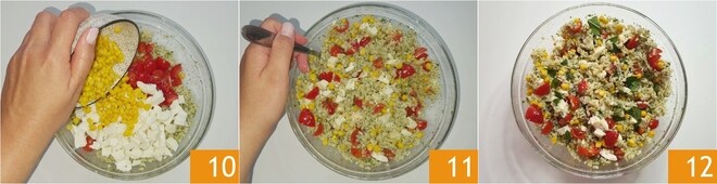 Adicione os tomatinhos, a mussarela e o milho drenado 10. Misture bem tudo 11, depois ajuste o sal e perfume com algumas folhas de manjericão. Sua salada de arroz vegetariana está pronta para ser servida 12!