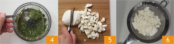 Bata intermitentemente até obter uma consistência cremosa 4, depois transfira o pesto para um frasco e coloque na geladeira até a hora de usar. Prepare também os outros ingredientes: corte a mussarela em cubos 5 e deixe escorrer em uma peneira para perder o excesso de líquido 6.