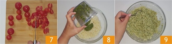 Lave os tomatinhos e divida-os em 4 partes 7. Agora transfira o arroz para uma tigela, adicione o pesto 8 e misture bem 9.